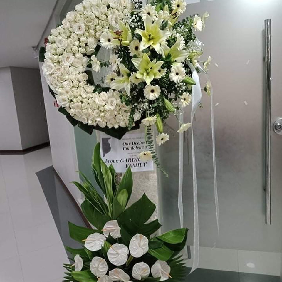 A Radiance Rose white funeral WreathThis bright sympathy wreath features an array of high quality vivid flowers such as: exotic lilies, exquisite roses, freshly picked seasonal blooms, and accents of lush greenery. Send it to the home of the bereaved family as an expression of your deepest sympathies, or to the funeral home for the memorial service and viewing.